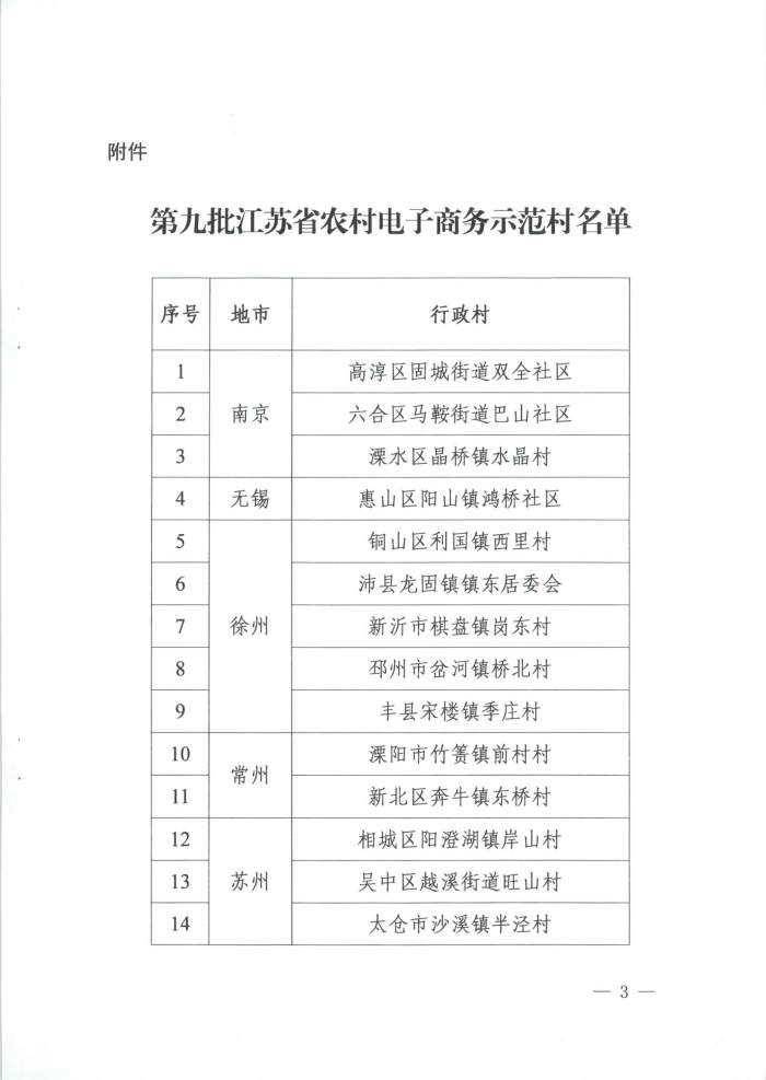 省商务厅关于公布第九批江苏省农村电子商务示范村的通知