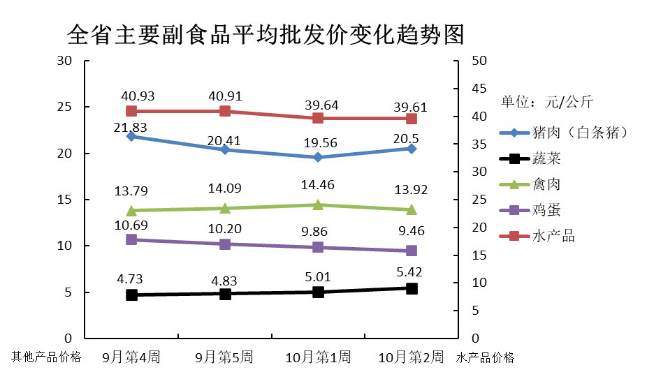 10月份第2周(2021年10月9日-10月15日),本周我省主要副食品平均批发价除猪肉和蔬菜涨势明显外其余产品价格均有所下跌,批发量除猪肉、水产品外其余产品均略有减少。平均批发价方面,蔬菜涨幅较大,猪肉在连续1个月持续下跌后转跌为涨,水产品与上周基本持平,禽肉和鸡蛋批发价小幅下跌;批发量方面,水产品增幅较大,猪肉有所增加,蔬菜和鸡蛋下降趋势不明显,禽肉微降。
