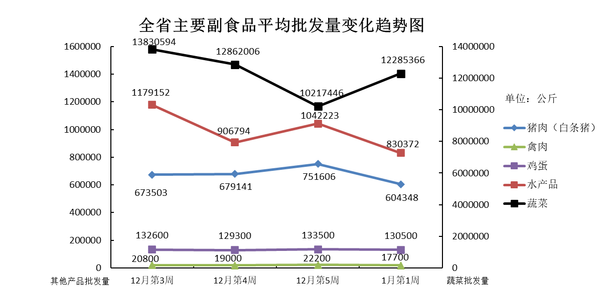 1月份第1周(2021年1月1日-1月7日),本周我省主要副食品平均批发价除蔬菜外其余产品均略有下跌,批发量除蔬菜外其余产品均环比减少。平均批发价方面,蔬菜微涨;禽肉跌势不明显,价格与上周基本持平;鸡蛋、水产品和猪肉均小幅下跌。批发量方面,除鸡蛋外其余产品波动幅度均在20%左右。蔬菜批发量大幅增加,鸡蛋略有减少,猪肉、水产品和禽肉批发量均大幅减少,并减至两周前水平。
