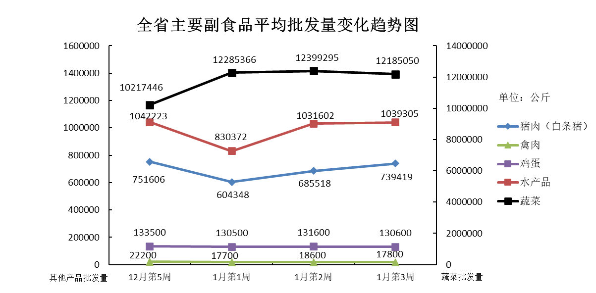 1月份第3周(2021年1月15日-1月21日),本周我省主要副食品平均批发价除鸡蛋外其余产品均有所上涨,批发量除猪肉和水产品外其余产品均环比减少。平均批发价方面,鸡蛋微跌;蔬菜和禽肉均涨势不明显,价格与上周基本持平;猪肉和水产品均小幅上涨。批发量方面,鸡蛋降幅不显著;蔬菜、禽肉略有减少;水产品增势不明显;猪肉环比增加。