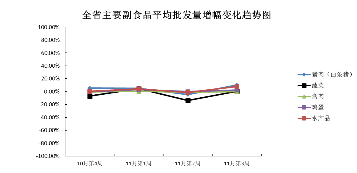 11月份第3周(2022年11月12日—11月18日),本周我省主要副食品平均批发价除蔬菜和禽肉外其余产品均有所下跌,产品批发量均有所增加。平均批发价方面,蔬菜和禽肉均环比上涨;猪肉跌势不明显,与上周基本持平;鸡蛋小幅下跌;水产品环比下跌。批发量方面,禽肉增幅与蔬菜增幅均不显著,与上周基本持平;鸡蛋、水产品和猪肉均环比增加。