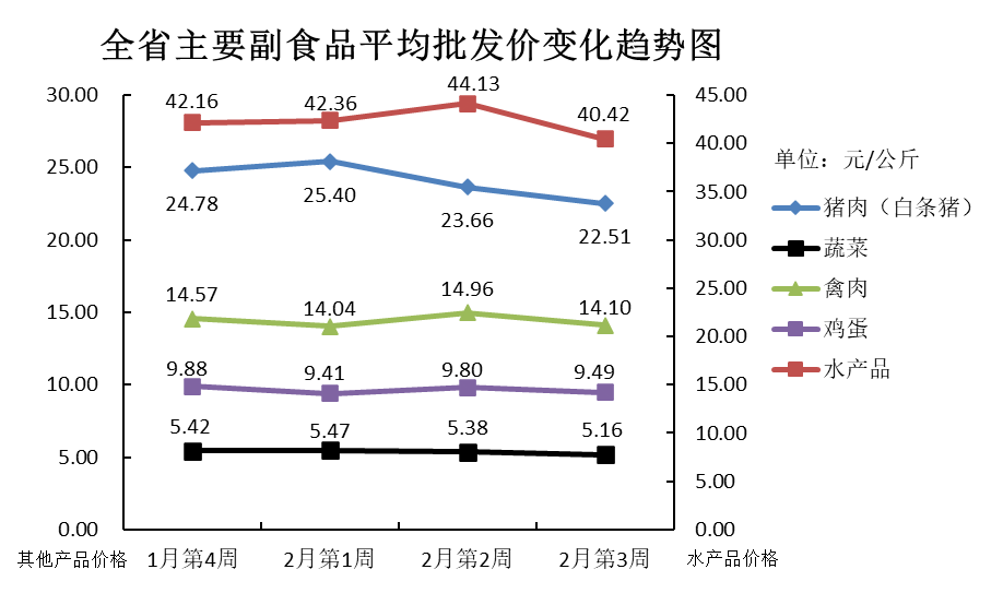 2月份第3周(2021年2月12日—2月18日),随着春节假期结束,节庆效应逐渐减弱,本周我省主要副食品平均批发价均有所下跌,批发量除水产品外其余产品均环比增加。平均批发价方面,猪肉、蔬菜、禽肉、鸡蛋环比下跌;水产品价格自连续4周连续上涨后转涨为跌。批发量方面,水产品小幅减少;蔬菜微增;鸡蛋、猪肉环比增加;禽肉大幅回升。