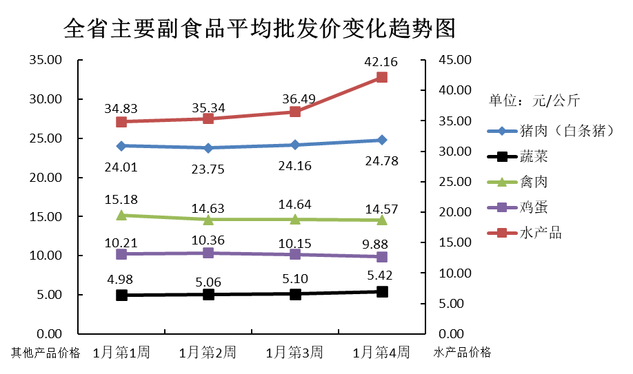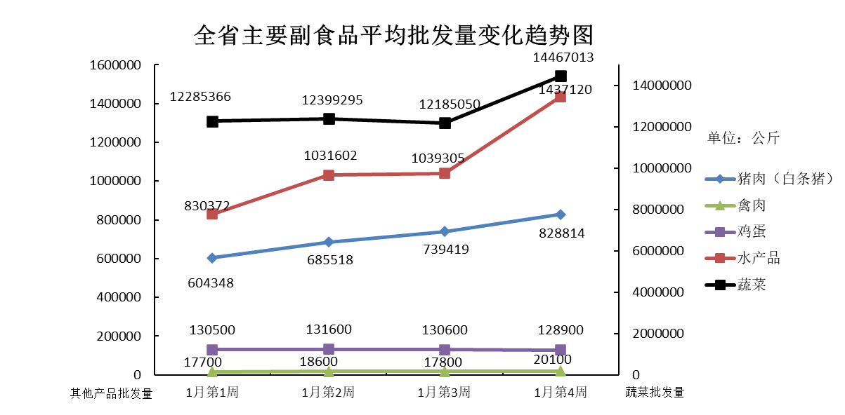 1月份第4周(2021年1月22日-1月28日),本周我省主要副食品平均批发价除禽肉和鸡蛋外其余产品均有所上涨,批发量除鸡蛋外其余产品均环比增加。平均批发价方面,禽肉跌势不明显,与上周基本持平;鸡蛋环比下跌;猪肉和蔬菜均环比上涨;水产品大幅上涨。批发量方面,鸡蛋微减;猪肉、蔬菜和禽肉环比增加;水产品在节日消费提振作用下增幅较大。