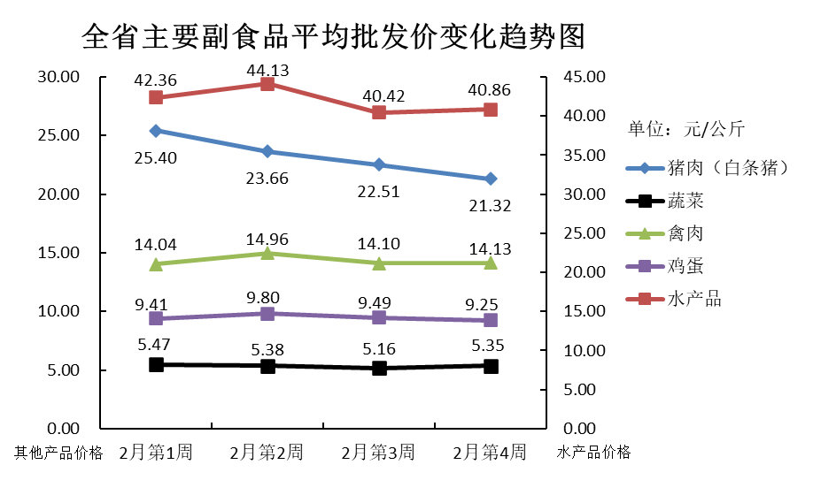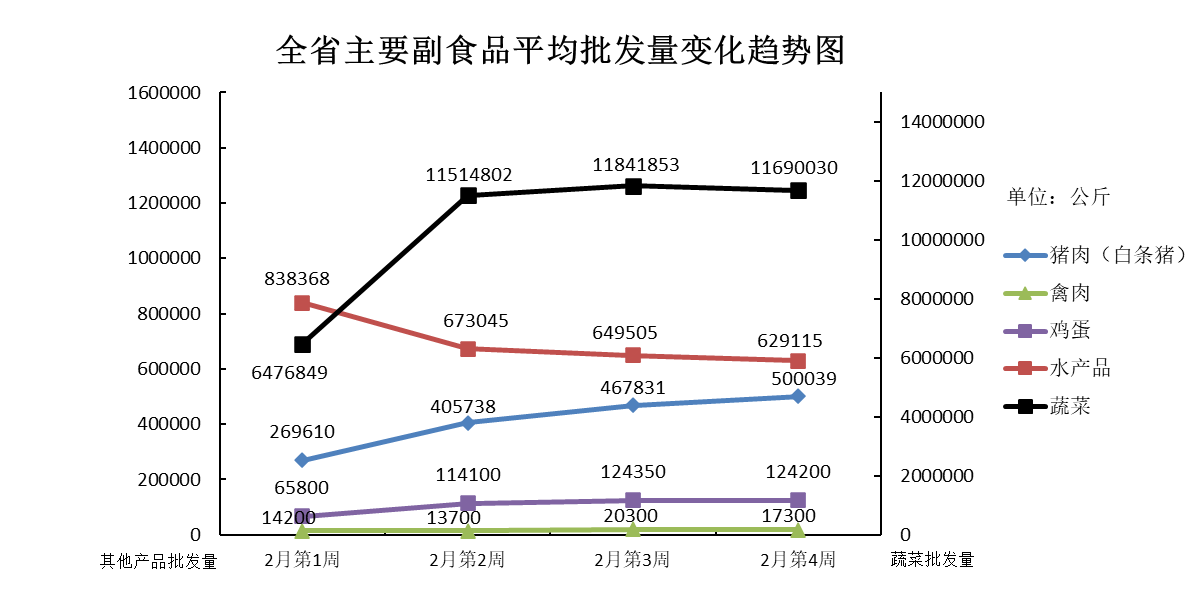 2月份第4周(2021年2月19日—2月25日),本周我省主要副食品平均批发价除猪肉和鸡蛋外其余产品均有所上涨,批发量除猪肉外其余产品均环比减少。平均批发价方面,猪肉、鸡蛋环比下跌;禽肉涨势不明显;水产品微涨;蔬菜环比上涨。批发量方面,猪肉环比增加;鸡蛋降幅不显著,与上周基本持平;蔬菜、水产品小幅减少;禽肉增幅略大。