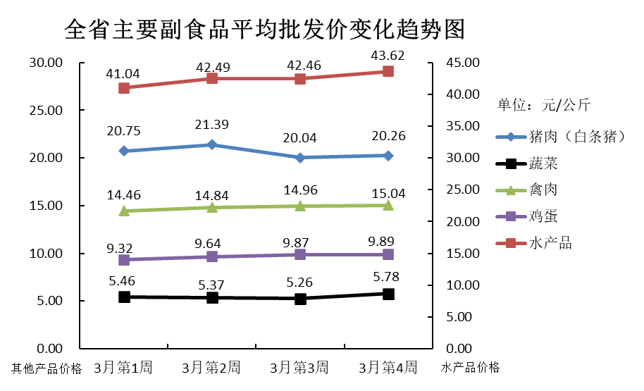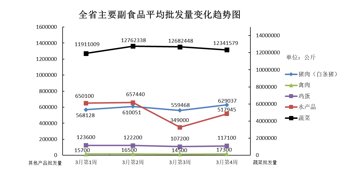 3月份第4周(2021年3月19日—3月25日),本周我省主要副食品平均批发价均有所上涨,批发量除蔬菜外其余产品均环比增加。平均批发价方面,禽肉和鸡蛋涨势不明显,与上周基本持平;水产品和猪肉小幅上涨;蔬菜涨幅较大。批发量方面,蔬菜微减,鸡蛋环比增加,猪肉、禽肉和水产品增幅均较大,随着疫情逐步得到控制,批发市场陆续恢复正常经营,批发交易量较上周有所增加。