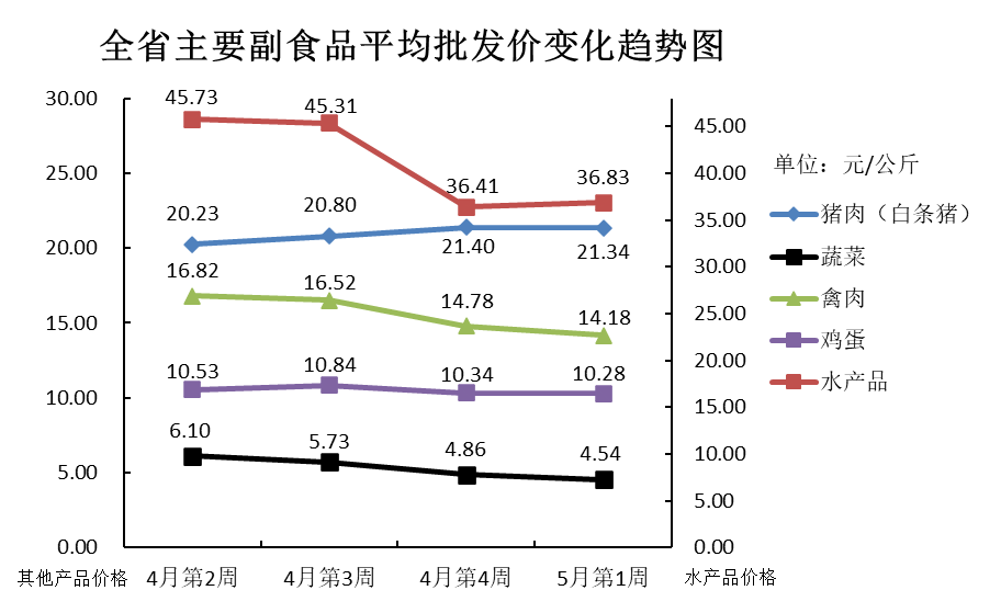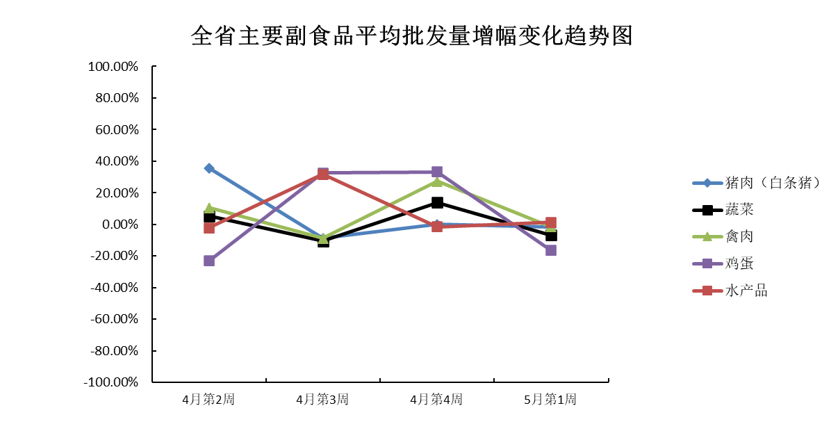 5月份第1周(2021年4月30日—5月6日),本周我省主要副食品平均批发价除水产品外其余产品均有所下跌,平均批发量除水产品外其余产品均有所减少。平均批发价方面,水产品小幅上涨;猪肉和鸡蛋跌势不明显,与上周基本持平;蔬菜和禽肉环比下跌。批发量方面,水产品小幅增加,猪肉和禽肉微减,蔬菜和鸡蛋环比减少。随着疫情逐步平稳,批发交易量波动性降低。