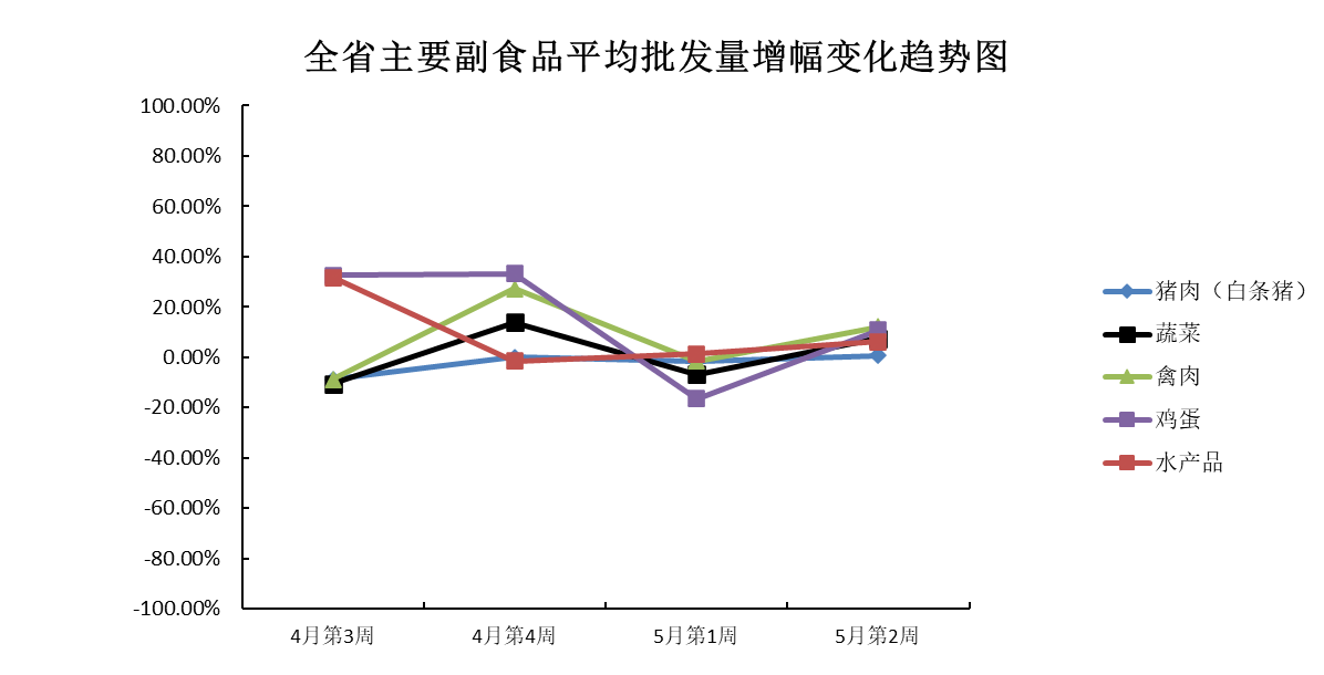 5月份第2周(2022年5月7日—5月13日),本周我省主要副食品平均批发价除猪肉和禽肉外其余产品均有所下跌,平均批发量均有所增加。平均批发价方面,禽肉涨势不明显,与上周基本持平;猪肉小幅上涨;水产品跌幅不显著,与上周基本持平,蔬菜、鸡蛋微跌。批发量方面,猪肉增势不明显,与上周基本持平;水产品、蔬菜环比增加;禽肉、鸡蛋增幅均略大于10%。