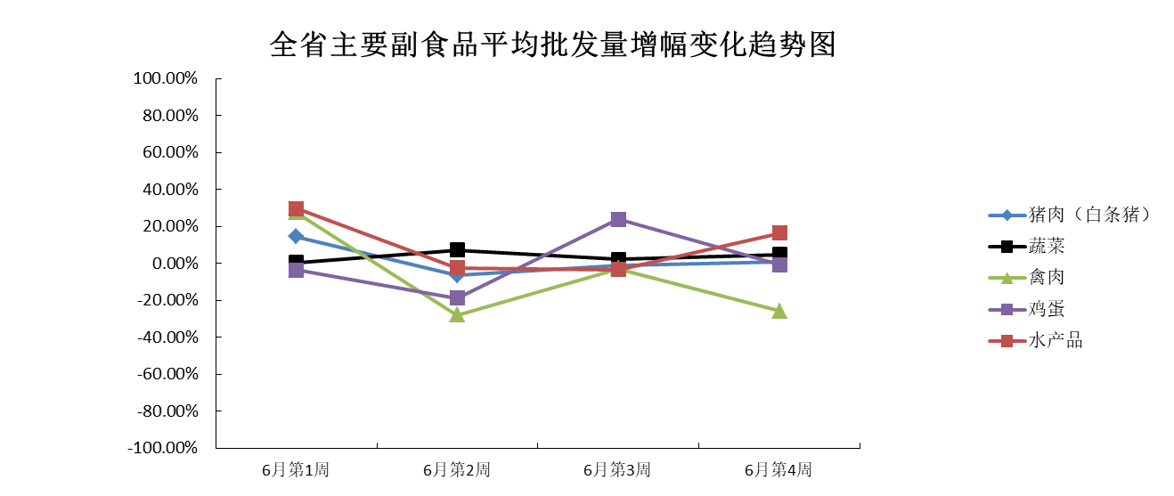 6月份第4周(2022年6月18日—6月24日),本周我省主要副食品平均批发价除水产品外均有所上涨,平均批发量除禽肉和鸡蛋外均有所增加。平均批发价方面,水产品小幅下跌;猪肉、鸡蛋、蔬菜和禽肉均环比上涨。批发量方面,鸡蛋降幅和猪肉增幅均不明显,与上周基本持平;蔬菜环比增加;水产品大幅增加;因商务部生活必需品监测系统调整,禽类监测剔除了白条鸭并新增活鸡,致使禽肉的批发量波动幅度较大。