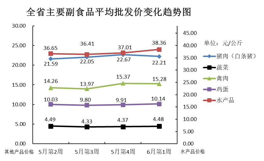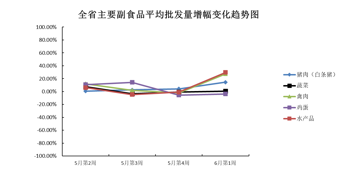 6月份第1周(2022年5月28日—6月3日),本周我省主要副食品平均批发价除猪肉和禽肉外均有所上涨,受端午节日提振效应影响,平均批发量除鸡蛋外均有所增加。平均批发价方面,禽肉跌势不明显,与上周基本持平;猪肉环比下跌;蔬菜、鸡蛋和水产品均环比上涨。批发量方面,鸡蛋小幅减少;蔬菜增幅不显著,与上周基本持平;猪肉、禽肉和水产品以大于10%的增幅增加。