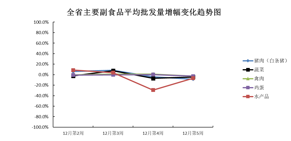 12月份第5周(2022年12月24日—12月30日),本周我省主要副食品市场运行情况:除蔬菜和禽肉外其余产品平均批发价均有所下跌,所有产品批发量均有所减少。平均批发价方面,蔬菜小幅上涨;禽肉涨势不明显,与上周基本持平;猪肉和水产品均微跌;鸡蛋环比下跌。批发量方面,所有品类均环比减少。