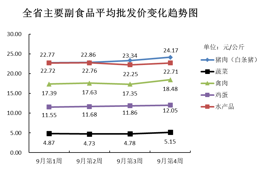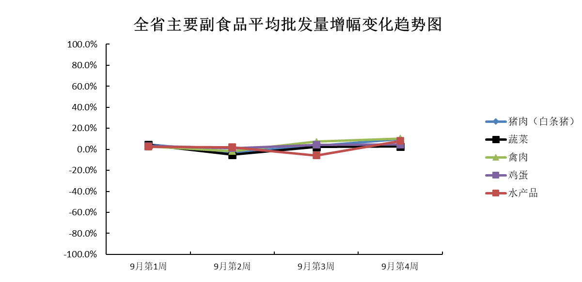 9月份第4周(2023年9月23日—9月29日),本周我省主要副食品市场运行情况:受中秋、国庆双节效应影响,所有产品平均批发价均上涨,批发量均增加。平均批发价方面,鸡蛋小幅上涨;猪肉、蔬菜、禽肉、水产品均环比上涨。批发量方面,所有产品均环比增加。