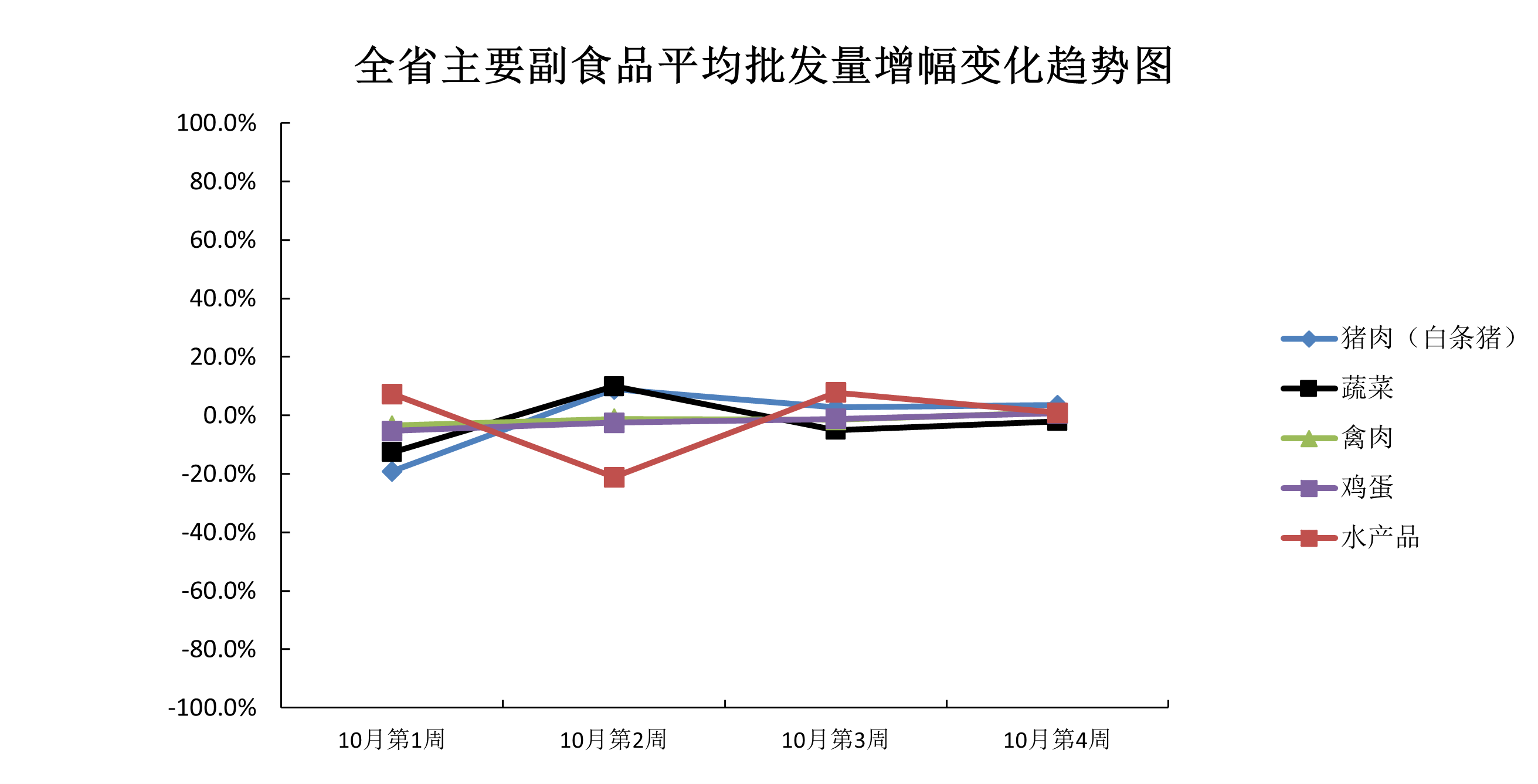 10月份第4周(2023年10月21日—10月27日),本周我省主要副食品市场运行情况:所有产品平均批发价均有所下跌,除蔬菜外其余产品批发量均有所增加。平均批发价方面,蔬菜、禽肉、鸡蛋均小幅下跌;猪肉、水产品均环比下跌。批发量方面,蔬菜环比减少;禽肉、鸡蛋、水产品均增加不明显,与上周基本持平;猪肉环比增加。