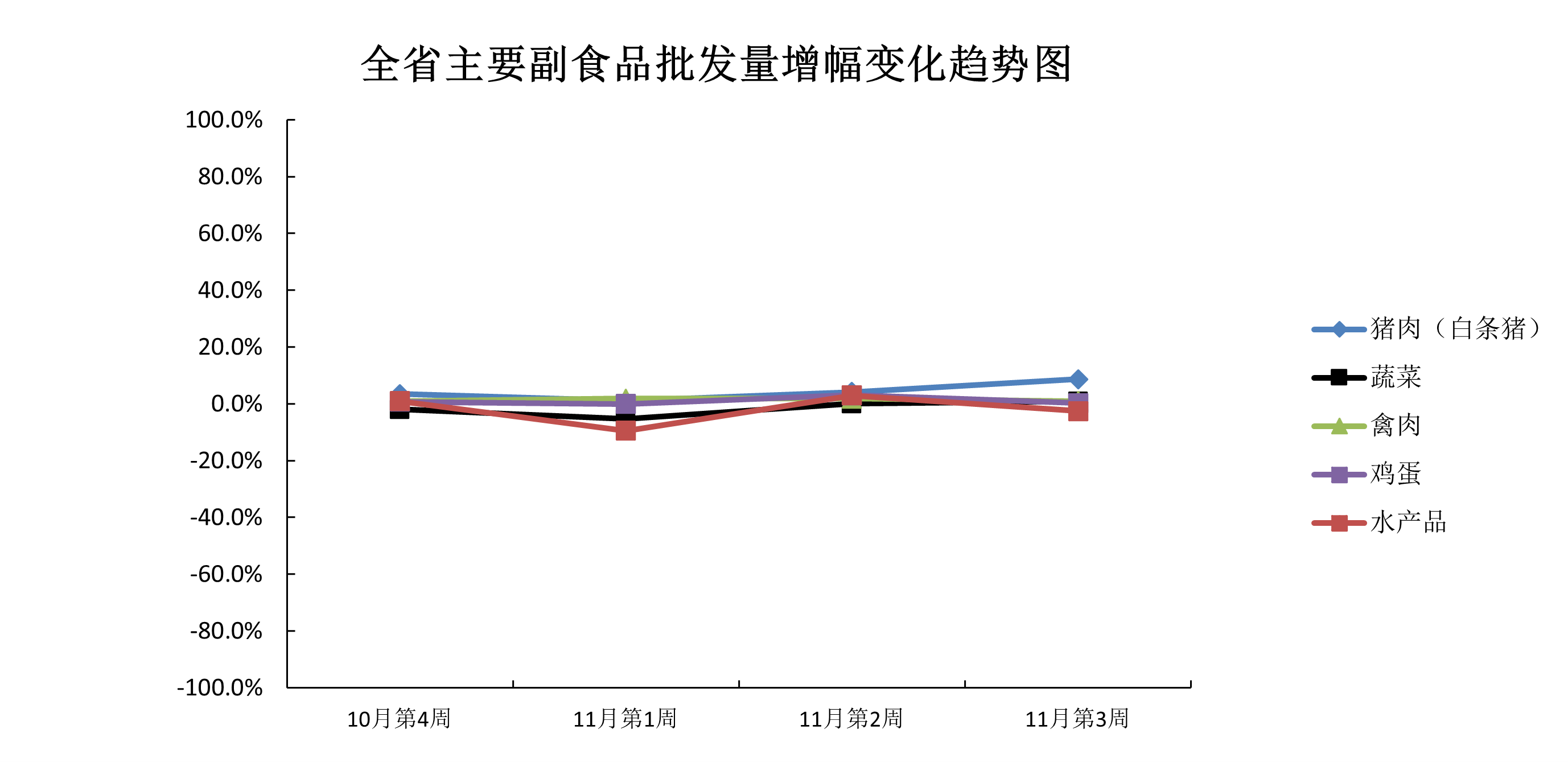 11月份第3周(2023年11月11日—11月17日),本周我省主要副食品市场运行情况:除蔬菜和禽肉外其余产品平均批发价均有所下跌,除水产品外其余产品批发量均有所增加。平均批发价方面,禽肉涨势和猪肉、鸡蛋跌势均不明显,与上周基本持平;蔬菜小幅上涨;水产品环比下跌。批发量方面,蔬菜、禽肉、鸡蛋增加不明显,与上周基本持平;猪肉环比增加; 水产品环比减少。