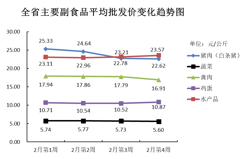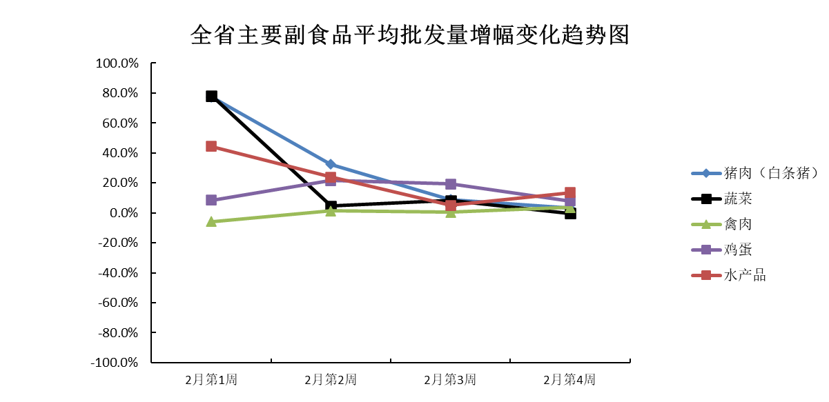 2月份第4周(2023年2月18日—2月24日),本周我省主要副食品市场运行情况:除鸡蛋和水产品外其余产品平均批发价均有所下跌;除蔬菜外其余产品批发量均有所增加。平均批发价方面,蔬菜和禽肉均环比下跌;猪肉跌势不明显,与上周基本持平;水产品微涨;鸡蛋环比上涨。批发量方面,蔬菜降幅不显著,与上周基本持平;猪肉、禽肉和鸡蛋均环比增加;水产品增幅较大。