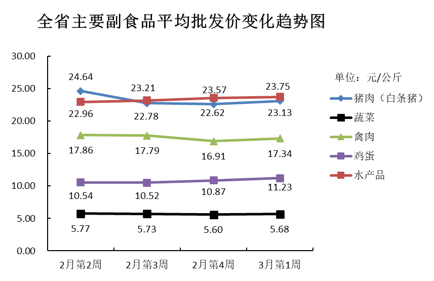 3月份第1周(2023年2月25日—3月3日),本周我省主要副食品市场运行情况:所有产品平均批发价均有所上涨;除蔬菜外其余产品批发量均有所增加。平均批发价方面,水产品涨势不明显,与上周基本持平;蔬菜微涨;猪肉、禽肉和鸡蛋均环比上涨。批发量方面,蔬菜降幅与鸡蛋增幅均不显著,与上周基本持平;猪肉小幅增加;禽肉环比增加;水产品增幅较大。