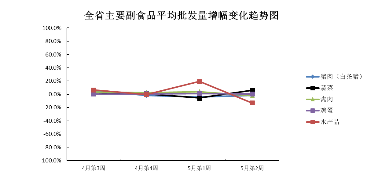 5月份第2周(2023年5月6日—5月12日),本周我省主要副食品市场运行情况:除猪肉和水产品外其余产品平均批发价均有所下跌;除蔬菜和鸡蛋外其余产品批发量均有所减少。平均批发价方面,蔬菜跌幅和水产品涨幅均不显著,与上周基本持平;禽肉和鸡蛋均环比下跌;猪肉环比上涨。批发量方面,鸡蛋增幅不显著,与上周基本持平;蔬菜环比增加;猪肉小幅减少;禽肉和水产品均环比减少。