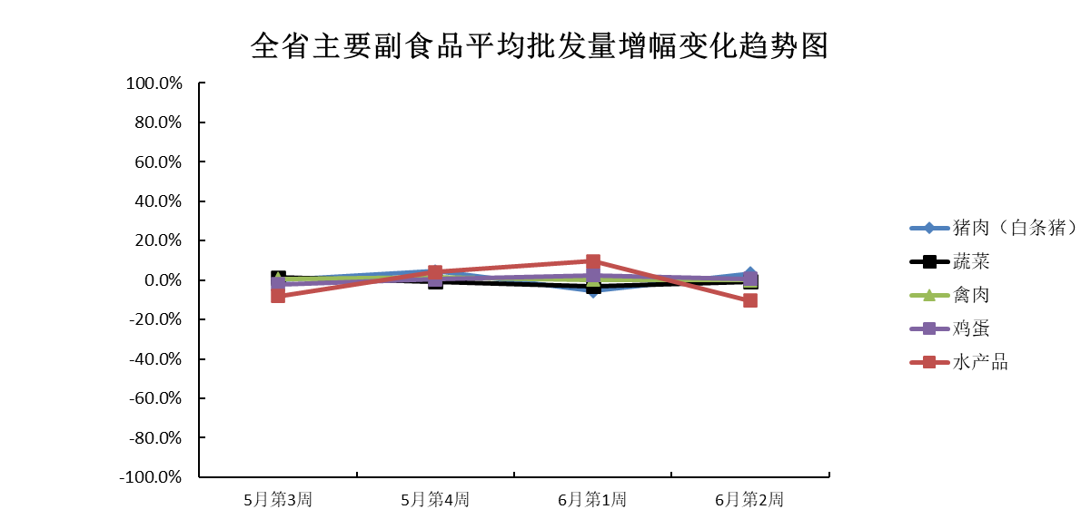 6月份第2周(2023年6月3日—6月9日),本周我省主要副食品市场运行情况:所有产品平均批发价均有所下跌;除蔬菜和水产品外其余产品批发量均有所增加。平均批发价方面,蔬菜和鸡蛋均小幅下跌;猪肉、禽肉均环比下跌;水产品跌幅较大。批发量方面,蔬菜降幅、禽肉增幅和鸡蛋增幅均不显著,与上周基本持平;猪肉环比增加;水产品环比减少。