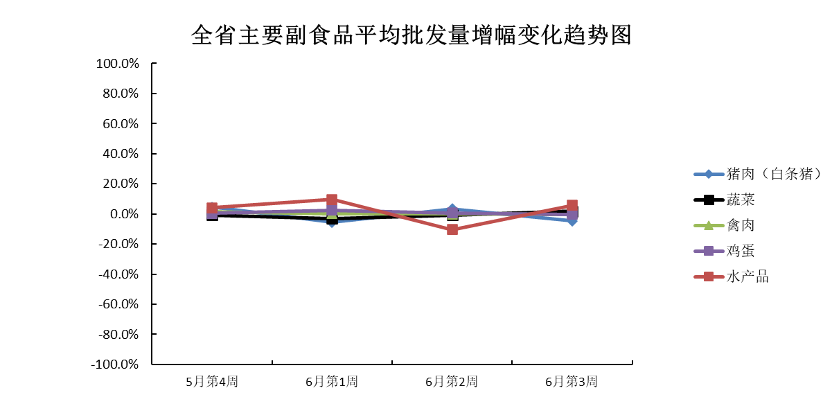 6月份第3周(2023年6月10日—6月16日),本周我省主要副食品市场运行情况:除蔬菜和水产品外其余产品平均批发价均有所下跌;除蔬菜和水产品外其余产品批发量均有所减少。平均批发价方面,猪肉和鸡蛋均环比下跌;禽肉跌势不明显,与上周基本持平;蔬菜和水产品均环比上涨。批发量方面,猪肉环比减少;禽肉和鸡蛋降幅均不显著,与上周基本持平;蔬菜小幅增加;水产品环比增加。