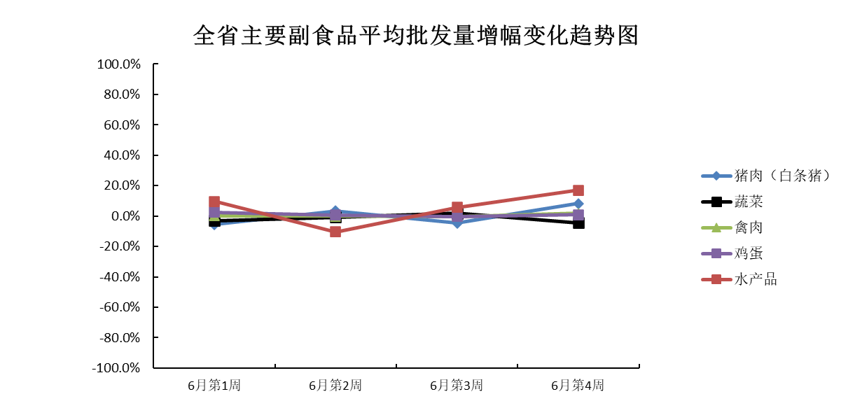 6月份第4周(2023年6月17日—6月23日),本周我省主要副食品市场运行情况:受端午节庆效应影响,所有产品平均批发价均有所上涨;除蔬菜外其余产品批发量均有所增加,其中猪肉和水产品增幅较大。平均批发价方面,水产品涨势不明显,与上周基本持平;猪肉、蔬菜、禽肉和鸡蛋均环比上涨。批发量方面,蔬菜环比减少;鸡蛋增幅不显著,与上周基本持平;禽肉小幅增加;猪肉和水产品均环比增加。