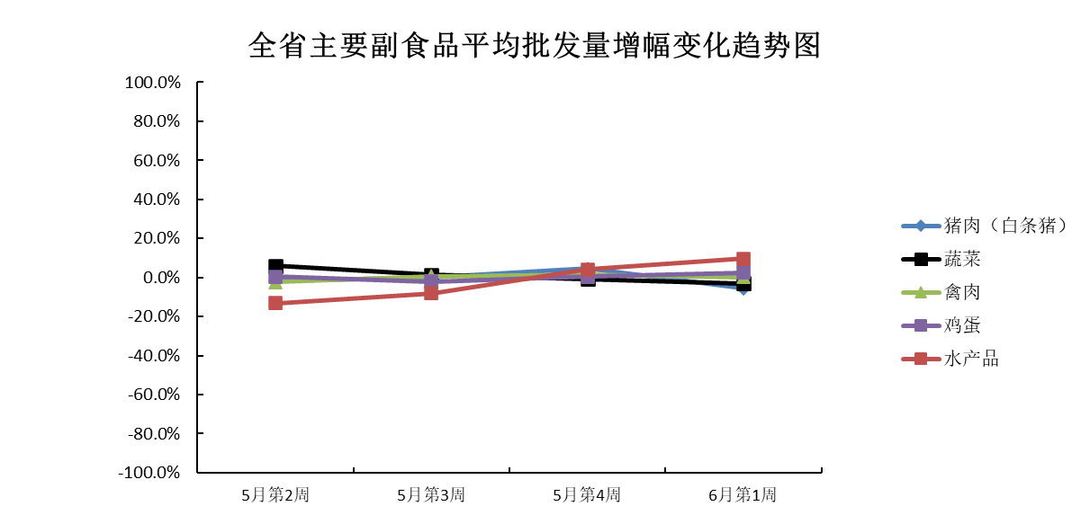 6月份第1周(2023年5月27日—6月2日),本周我省主要副食品市场运行情况:所有产品平均批发价均有所下跌;除猪肉和蔬菜外其余产品批发量均有所增加。平均批发价方面,所有产品均小幅下跌。批发量方面,猪肉和蔬菜均环比减少;禽肉增幅不显著,与上周基本持平;鸡蛋和水产品均环比增加。