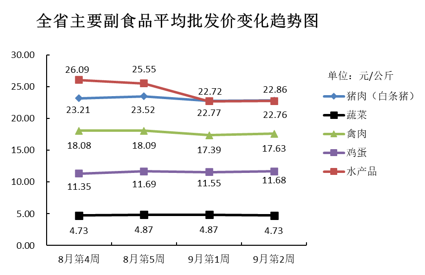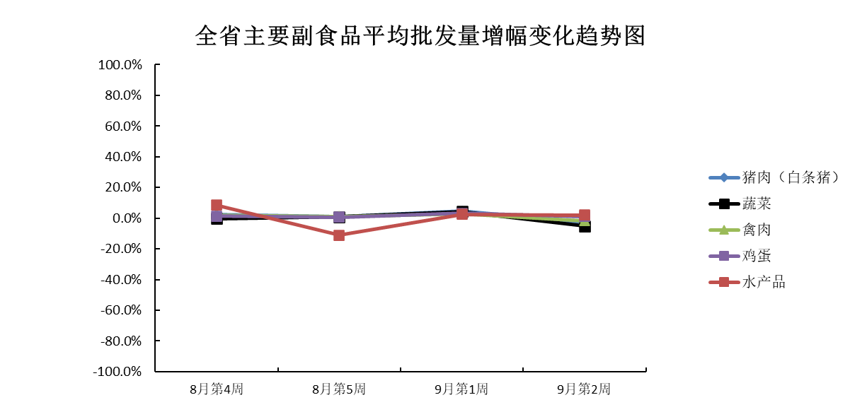 9月份第2周(2023年9月9日—9月15日),本周我省主要副食品市场运行情况:除蔬菜外其余产品平均批发价均有所上涨;除鸡蛋和水产品外其余产品批发量均有所减少。平均批发价方面,蔬菜环比下跌;猪肉和水产品涨势均不明显,与上周基本持平;禽肉和鸡蛋均小幅上涨。批发量方面,鸡蛋小幅增加;水产品环比增加;禽肉微减;猪肉和蔬菜均环比减少。