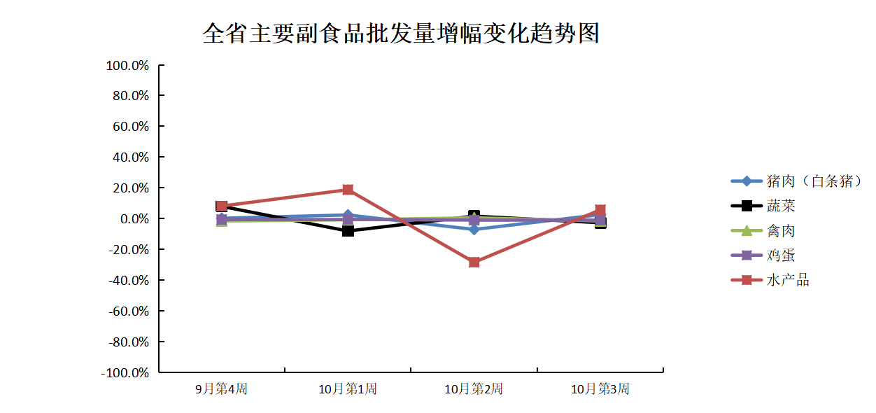 10月份第3周(2024年10月12日—2024年10月18日),本周我省主要副食品市场运行情况:除禽肉和鸡蛋外其余产品平均批发价均有所下跌;除猪肉和水产品外其余产品产品批发量均有所减少。平均批发价方面,猪肉小幅下跌;鸡蛋小幅上涨;蔬菜和水产品均环比下跌;禽肉环比上涨。批发量方面,禽肉和鸡蛋均小幅减少;蔬菜环比减少;猪肉和水产品均环比增加。