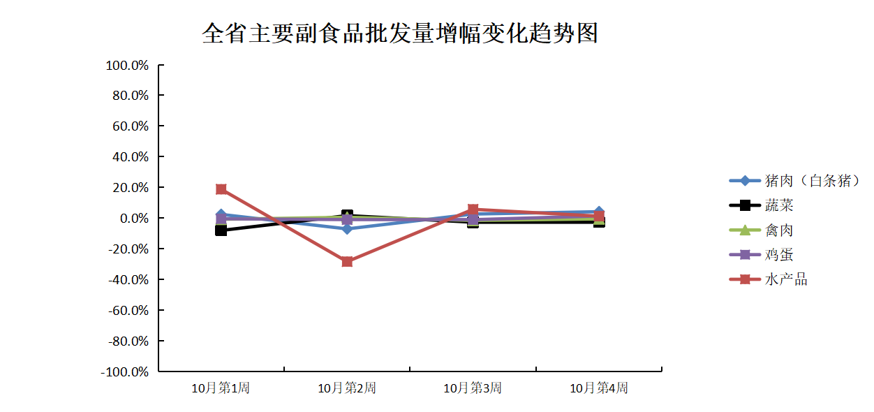 10月份第4周(2024年10月19日—2024年10月25日),本周我省主要副食品市场运行情况:除蔬菜和禽肉外其余产品平均批发价均有所上涨;除蔬菜和禽肉外其余产品产品批发量均有所增加。平均批发价方面,猪肉、水产品上涨和蔬菜下跌均不明显,与上周基本持平;禽肉环比下跌;鸡蛋环比上涨。批发量方面,禽肉减少不明显,与上周基本持平;鸡蛋和水产品均小幅增加;蔬菜环比减少;猪肉环比增加。