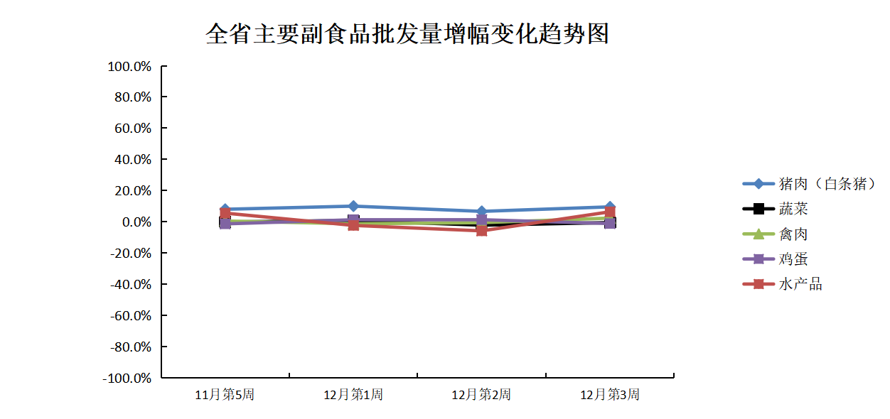 12月份第3周(2024年12月14日—2024年12月20日),本周我省主要副食品市场运行情况:除猪肉和禽肉外其余产品平均批发价均有所上涨;除蔬菜和鸡蛋外其余产品批发量均有所增加。平均批发价方面,水产品上涨不明显,与上周基本持平;鸡蛋小幅上涨;蔬菜环比上涨;猪肉小幅下跌;禽肉环比下跌。批发量方面,蔬菜减少不明显,与上周基本持平;鸡蛋小幅减少;猪肉、禽肉和水产品均环比增加。