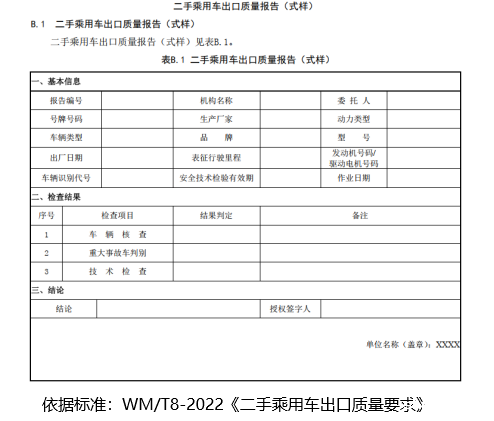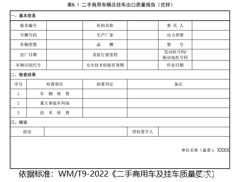 6.须按《二手乘用车出口质量要求》(WM/T8-2022)、《二手商用车辆及挂车出口质量要求》(WM/T9-2022)进行检测。