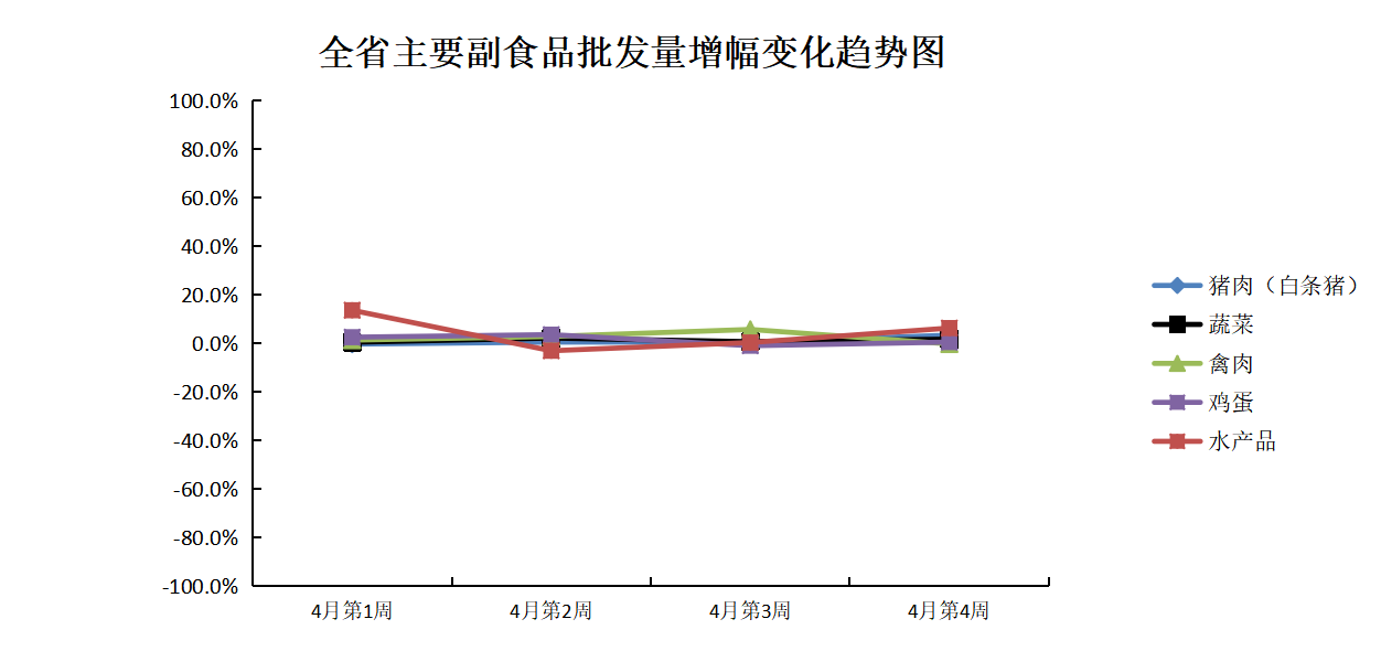 4月份第4周(2024年4月20日—2024年4月26日),本周我省主要副食品市场运行情况:除蔬菜、鸡蛋和水产品外其余产品平均批发价均有所上涨;除禽肉外其余产品批发量均有所增加。平均批发价方面,水产品与上周持平;猪肉上涨不明显,与上周基本持平;鸡蛋小幅下跌;蔬菜环比下跌;禽肉环比上涨。批发量方面,禽肉减少和鸡蛋增加均不明显,与上周基本持平;蔬菜小幅增加;猪肉和水产品环比增加。