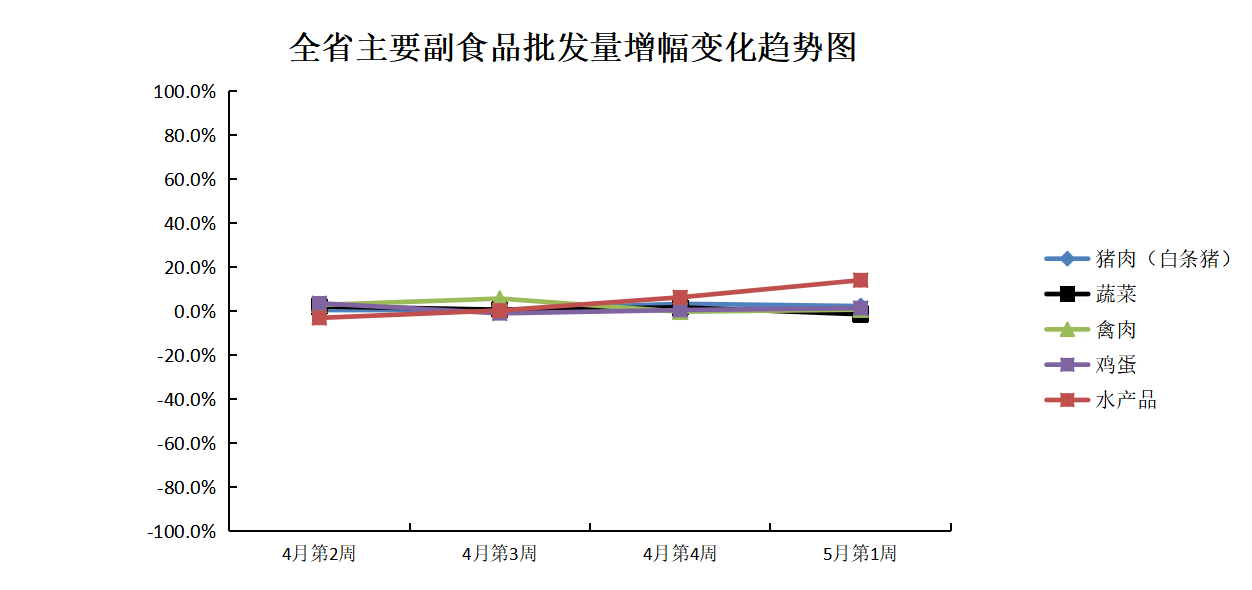 5月份第1周(2024年4月27日—2024年5月3日),本周我省主要副食品市场运行情况:除猪肉和鸡蛋外其余产品平均批发价均有所上涨;除蔬菜外其余产品批发量均有所增加。平均批发价方面,蔬菜和禽肉小幅上涨;水产品环比上涨;猪肉和鸡蛋小幅下跌。批发量方面,禽肉增加不明显,与上周基本持平;鸡蛋小幅增加;蔬菜小幅减少;猪肉环比增加;因五一假期群体性消费增多,水产品增幅较大。