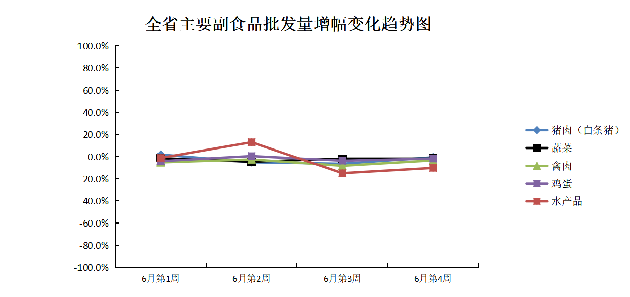 6月份第4周(2024年6月22日—2024年6月28日),本周我省主要副食品市场运行情况:除蔬菜和鸡蛋外其余产品平均批发价均有所下跌;所有产品批发量均有所减少。平均批发价方面,鸡蛋小幅上涨;蔬菜环比上涨;猪肉、禽肉和水产品均环比下跌。批发量方面,猪肉减少不明显,与上周基本持平;蔬菜和鸡蛋均小幅减少;禽肉和水产品均环比减少。