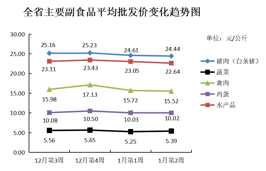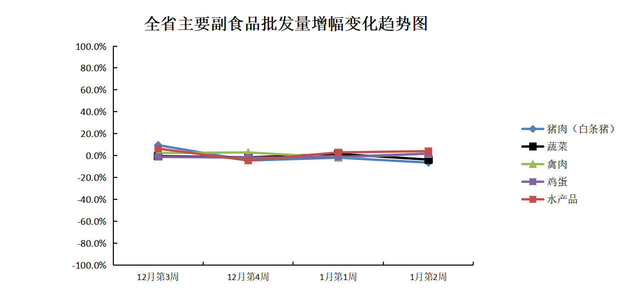 1月份第2周(2025年1月4日—2025年1月10日),本周我省主要副食品市场运行情况:除蔬菜外其余产品平均批发价均有所下跌;除猪肉和蔬菜外其余产品批发量均有所增加。平均批发价方面,猪肉和鸡蛋下跌均不明显,与上周基本持平;禽肉和水产品均小幅下跌;蔬菜环比上涨。批发量方面,猪肉和蔬菜均环比减少;禽肉和鸡蛋均小幅增加;水产品环比增加。