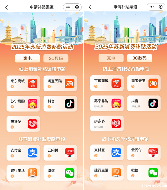 【3C补贴】线上补贴资格申领渠道有京东、天猫(其它平台将陆续上线);线下补贴资格申领渠道有:支付宝、云闪付、建行生活、微信支付。