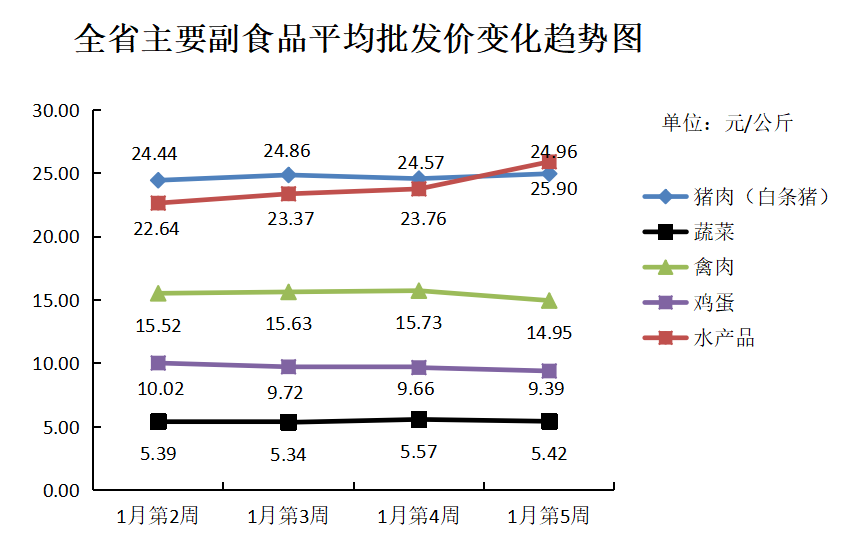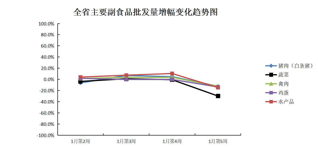 1月份第5周(2025年1月25日—2025年1月31日),本周我省主要副食品市场运行情况:除猪肉和水产品外其余产品平均批发价均有所下跌;因春节假期部分商户放假歇业,所有产品批发交易量均大幅减少。平均批发价方面,猪肉小幅上涨;水产品环比上涨;蔬菜、禽肉和鸡蛋均环比下跌。