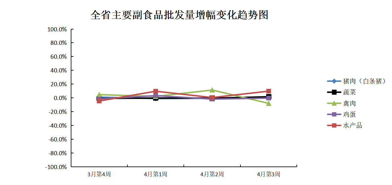 4月份第3周(2025年4月12日—2025年4月18日),本周我省主要副食品市场运行情况:除蔬菜和禽肉外其余产品平均批发价均有所上涨;除禽肉和鸡蛋外其余产品批发量均有所增加。平均批发价方面:猪肉上涨不明显,与上周基本持平;鸡蛋和水产品均环比上涨;蔬菜小幅下跌;禽肉环比下跌。批发量方面:鸡蛋减少不明显,与上周基本持平;禽肉环比减少;猪肉和蔬菜均小幅增加;水产品环比增加。