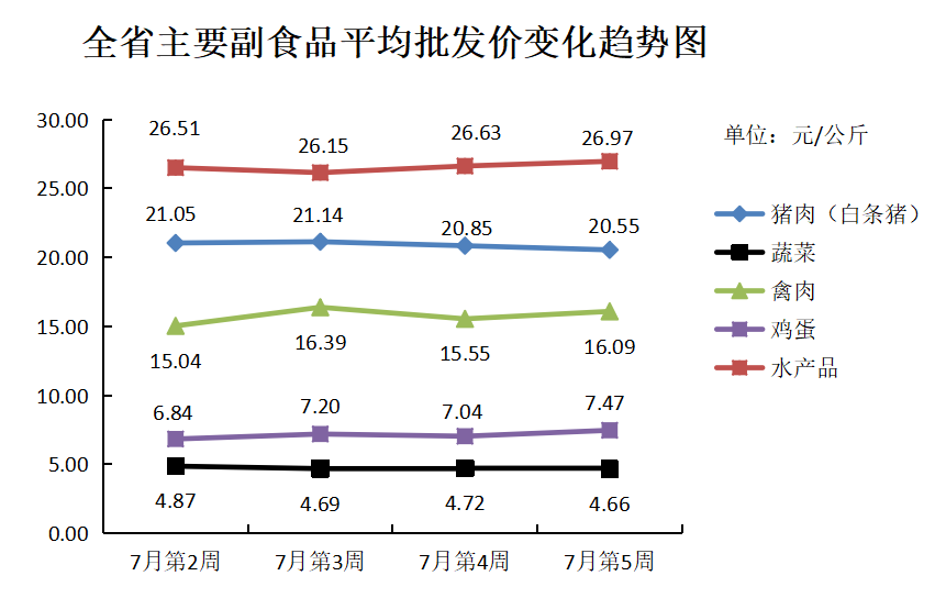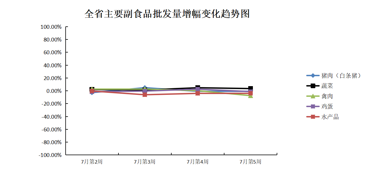 7月份第5周(2025年7月26日—8月1日),本周我省主要副食品市场运行情况:除猪肉、蔬菜外其余产品平均批发价均有所上涨;除蔬菜外其余产品批发量均有所减少。平均批发价方面:猪肉、蔬菜小幅下跌;水产品小幅上涨;禽肉、鸡蛋环比上涨;批发量方面:猪肉减少不明显,与上周基本持平;蔬菜环比增加;鸡蛋小幅减少;禽肉、水产品环比减少。